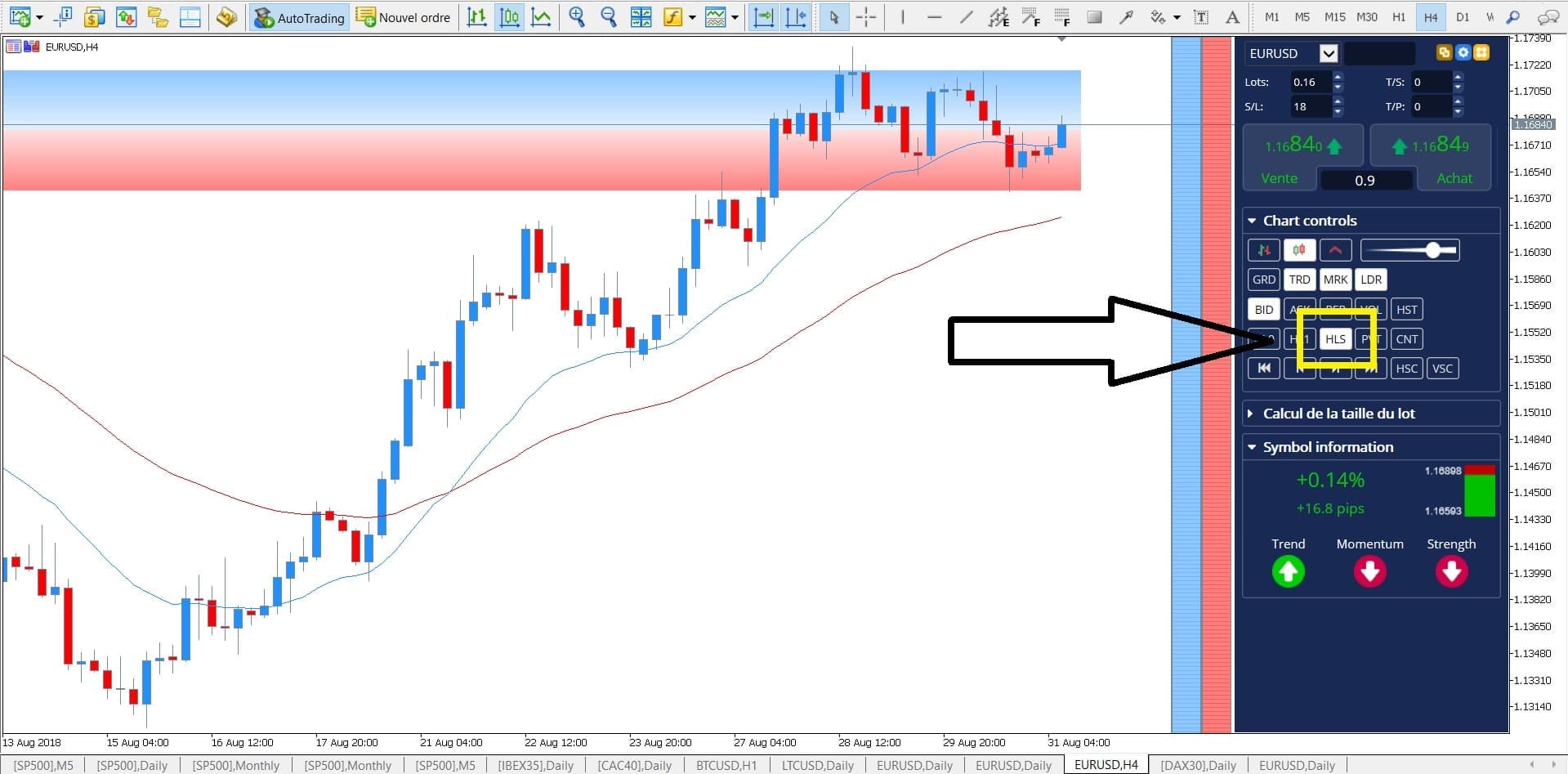 This button allows you to automatically identify the last top and bottom to find the closest supports and resistances without forgetting the trend and the momentum.